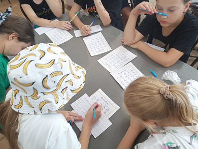 24.07.2023 г. студенты Катайского профессионально-педагогического техникума организовали для детей, отдыхающих в загородном оздоровительном лагере им. Полка «Красные Орлы», педагогический клуб «Буквы разные писать тонким перышком в тетрадь…»: викторина, тренинги по каллиграфии, конкурсы – атмосфера педагогической деятельности была создана. Все участники получили сертификаты.