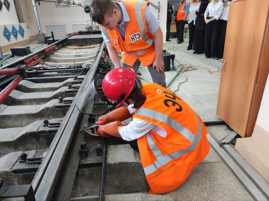 • В лаборатории «Инфраструктура электроснабжения» прошла профпроба «Электромонтер контактной сети». Ребята узнали о профессии и попробовали установить заземление, без которого невозможно начать работу на путях.
